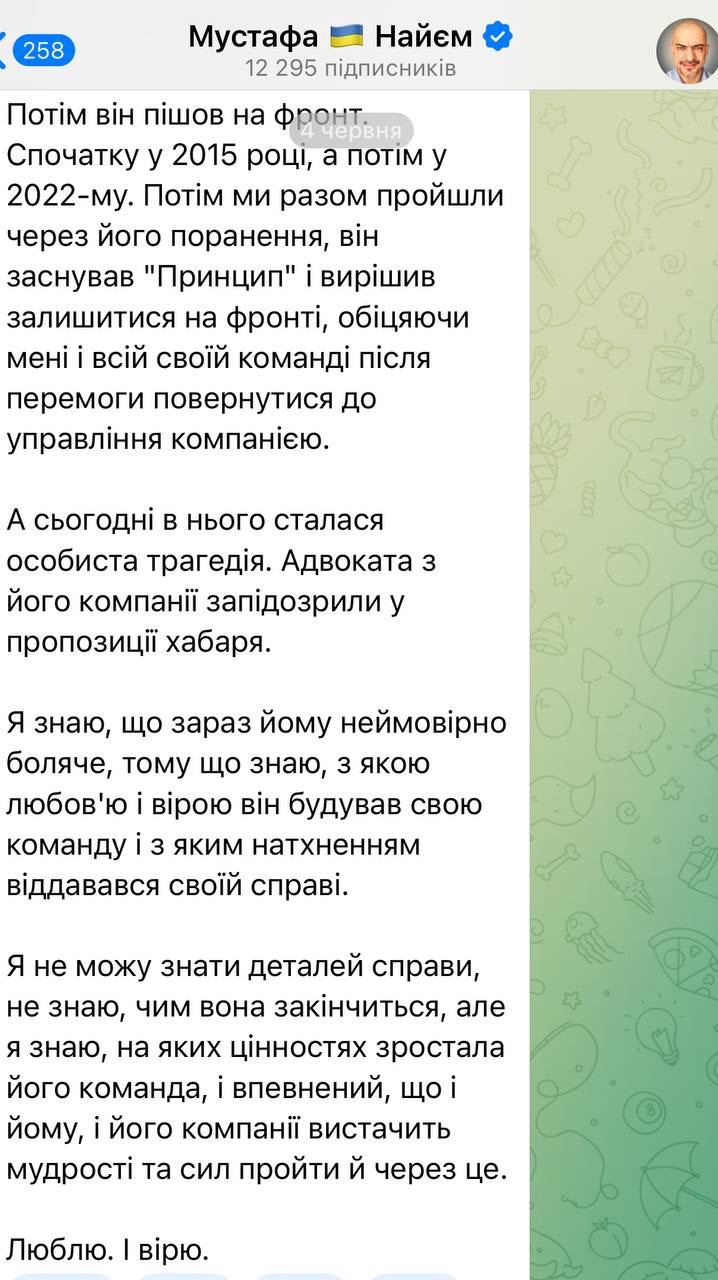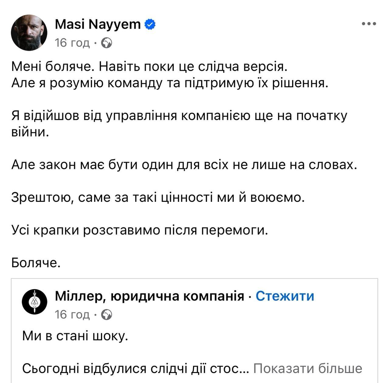 "Мне больно. Даже пока это следственная версия. Но закон должен быть один для всех не только на словах", – написал Маси Найем в Фейсбуке.