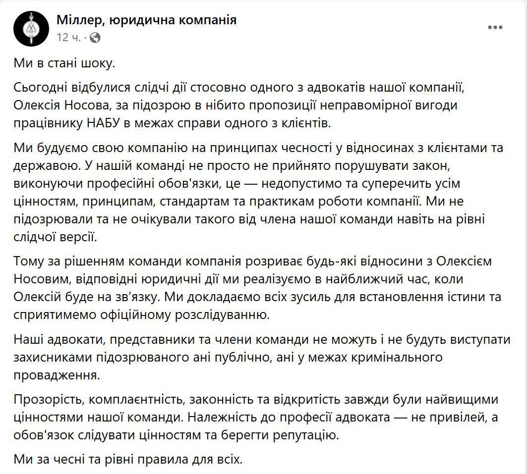 Отметим, что адвокат Носов был известен как защитник экс-главы "Нафтогаза" Андрея Коболева, которого подозревают в незаконном получении премии на 10 миллионов долларов. В качестве адвоката Коболева он давал многочисленные комментарии в СМИ.