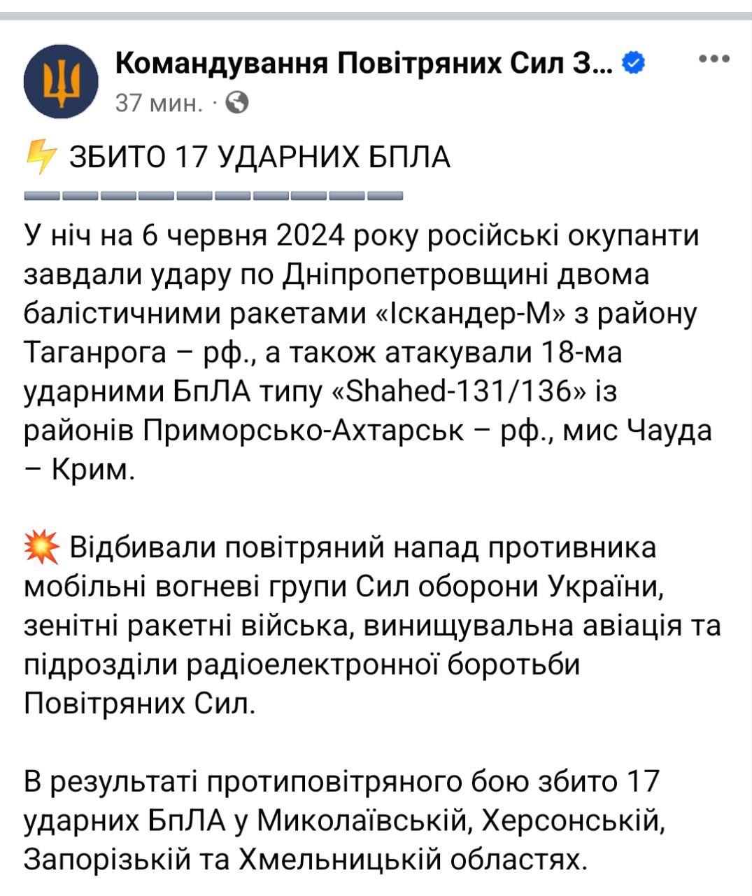 Ночью 6 июня Россия ударила по Днепропетровской области двумя ракетами "Искандер-М".