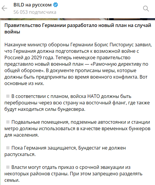 Напомним, накануне министр обороны ФРГ Борис Писториус заявил, что Германия должна быть готова к войне с Россией к 2029 году.