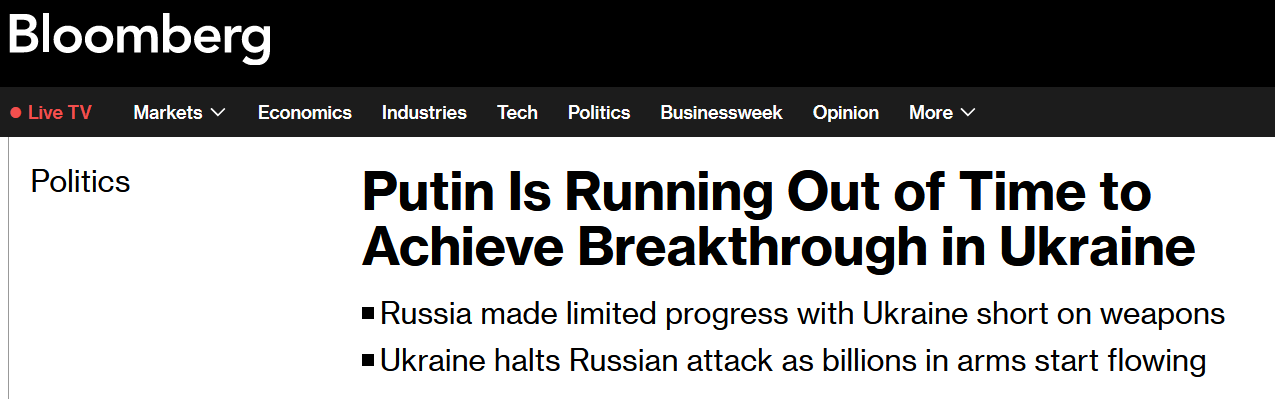 При этом Путин настаивает на том, что его военные цели неизменны, и что Россия будет воевать столько, сколько потребуется для победы в Украине. В это же время перед Киевом и западными союзниками стоит вызов сохранения способности к сопротивлению в войне, что в значительной степени зашла в тупик, считает Bloomberg.
