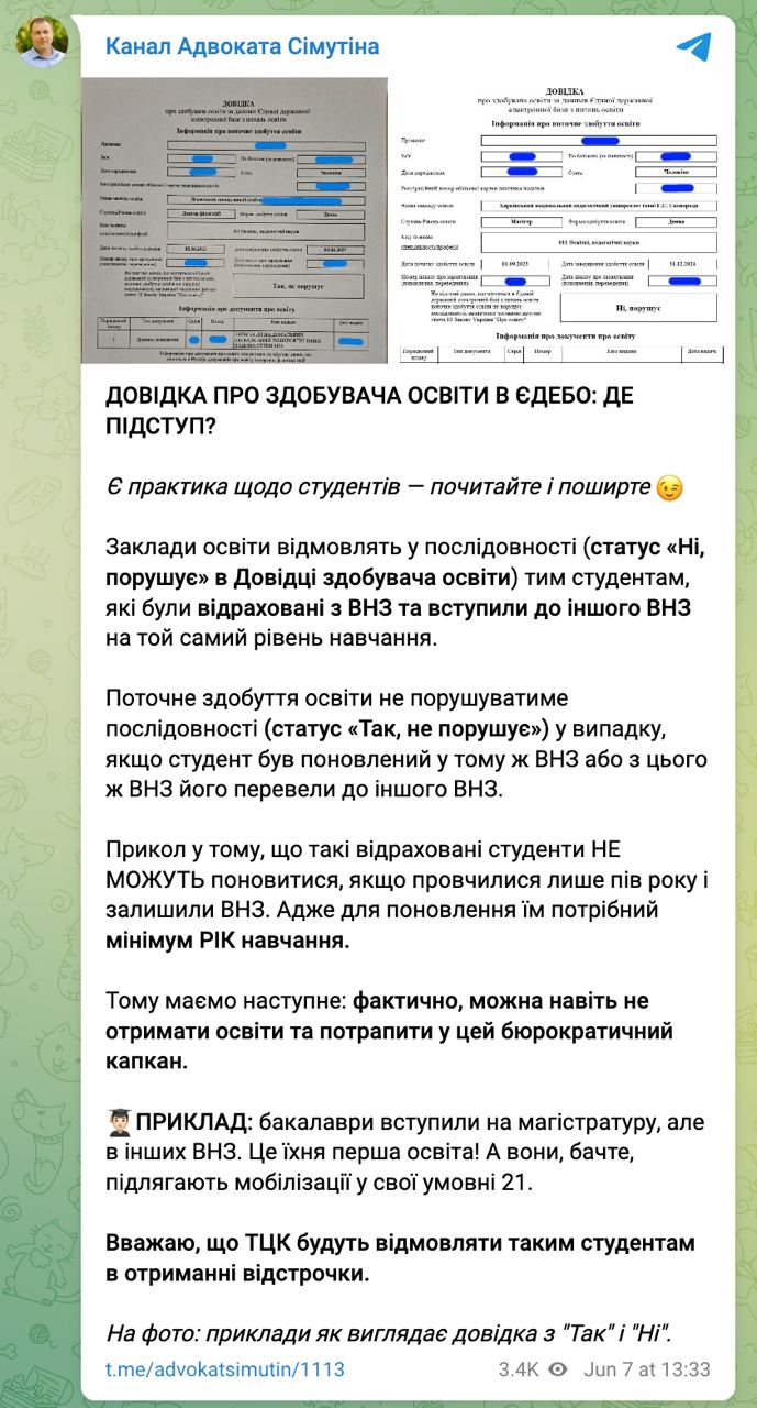 "Текущее получение образования не будет нарушать последовательность в случае, если студент был восстановлен в том же вузе или из этого же вуза его перевели в другой вуз. Прикол в том, что такие отчисленные студенты не могут восстановиться, если проучились всего полгода и покинули вуз. Ведь для восстановления им нужен минимум год обучения. Поэтому имеем следующее: фактически можно даже не получить образования и попасть в этот бюрократический капкан", - сказано в публикации Симутина.