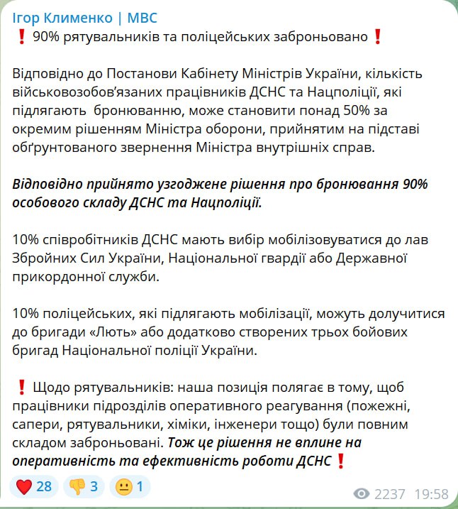 "Соответственно, принято согласованное решение о бронировании 90% личного состава ГСЧС и Нацполиции", – сообщил Клименко.