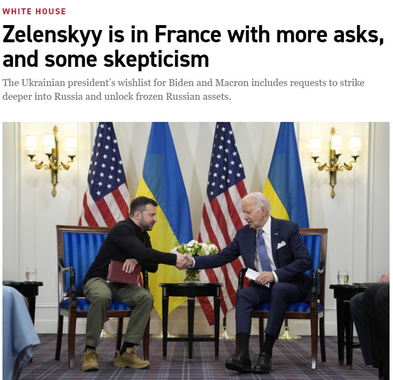 Издание пишет со ссылкой на украинские источники, что Зеленский привез в Париж ключевые пожелания: изъятие 300 млрд долларов российских активов для помощи Украине и снятие запрета на применение западного оружия дальше пограничной полосы РФ.