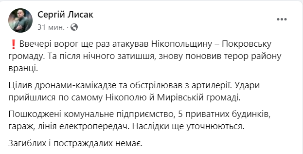 Вечером враг атаковал Покровскую громаду. А утром удары пришлись по самому Никополю и Мировской громаде.