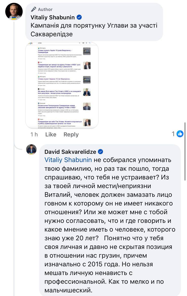 "Не собирался упоминать твою фамилию, но раз так пошло, тогда спрашиваю, что тебя не устраивает? Из-за твоей личной мести/неприязни Виталий, человек должен замазать лицо говном к которому он не имеет никакого отношения? Или же может мне с тобой нужно согласовать, что и где говорить и какое мнение иметь о человеке, которого знаю уже 20 лет? Понятно, что у тебя своя личная и давно не скрытая позиция в отношении нас, грузин, причем изначально с 2015 года. Но нельзя мешать личную ненависть с профессиональной. Как то мелко и по мальчишеский", - написал Сакварелидзе.