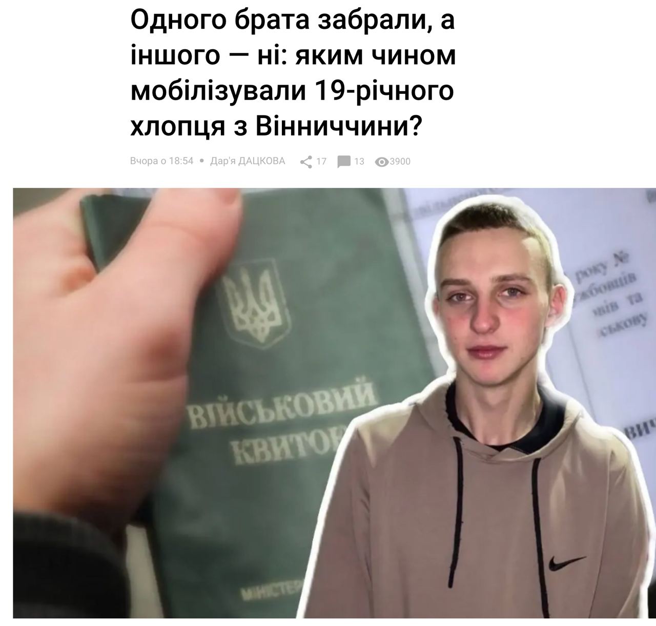 Он прокомментировал ситуацию в Винницкой области, когда двух 19-летних братьев забрали с рыбалки в ТЦК, после чего одного из них (с проблемами со здоровьем) мобилизовали, а второго (без проблем со здоровьем) отпустили домой.