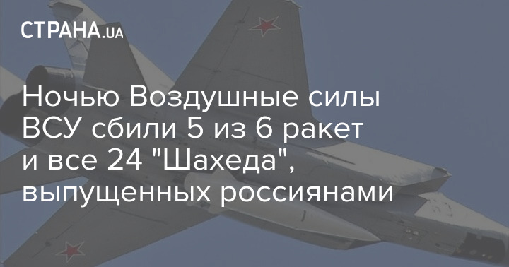 Ночью 12 июня Воздушные силы ВСУ сбили пять из шести российских ракет и все 24 беспилотника "Шахед", атаковавших Украину.