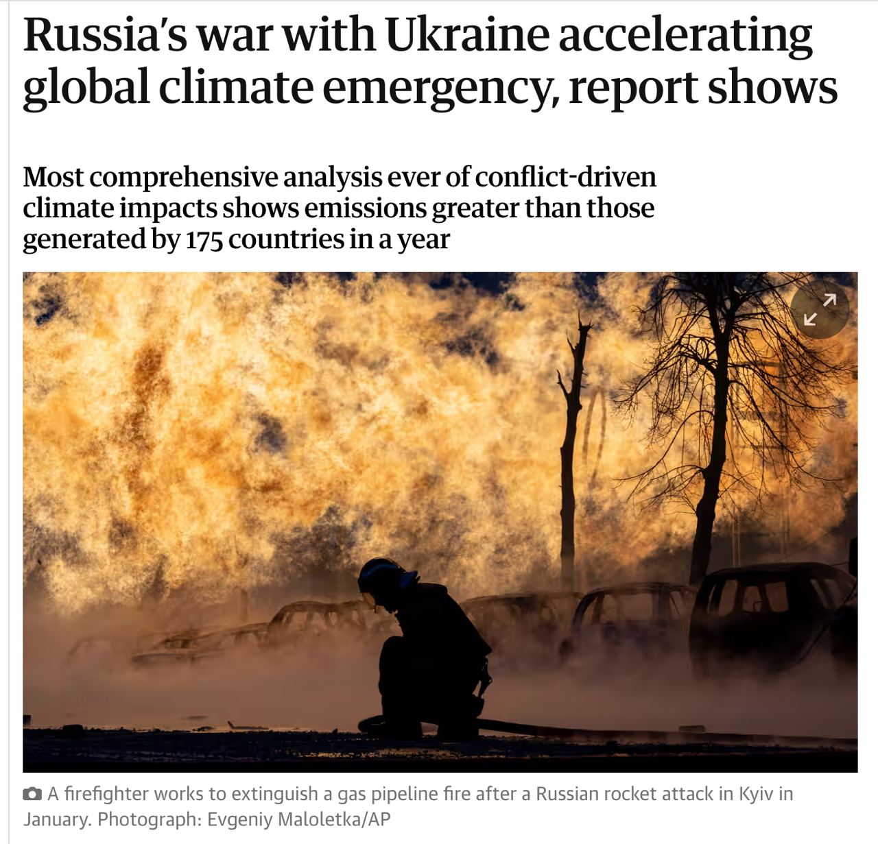 "Климатические издержки первых двух лет войны России с Украиной превысили ежегодные выбросы парниковых газов, производимые 175 странами по отдельности, что усугубило глобальную климатическую чрезвычайную ситуацию", - пишет издание.