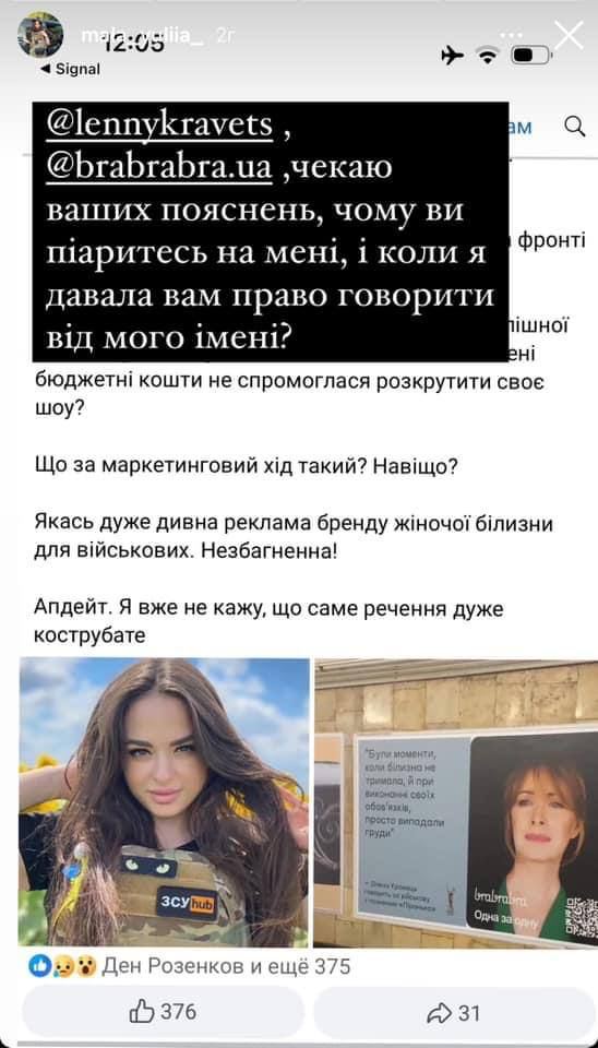 "Ваша реклама с Кравец - это дно дна: "говорит за военную "Пиранька"... а "Пиранька" недостойна быть на фото?"; "Непонятно, какое отношение к военным имеет Елена Кравец. С таким же успехом можно было Кошевого разместить или еще какого-нибудь участника клуба-95", - поддержали Малу пользователи.
