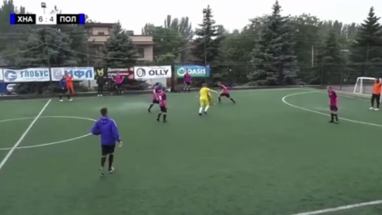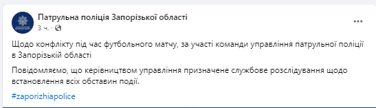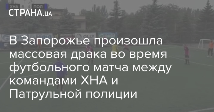 В Запорожье во время футбольного матча между командами Хортицкой национальной академии (футболисты в красной форме) и Патрульной полиции (в желтой форме), произошла массовая драка на поле.