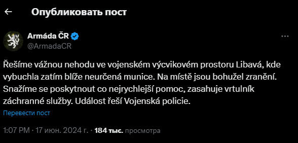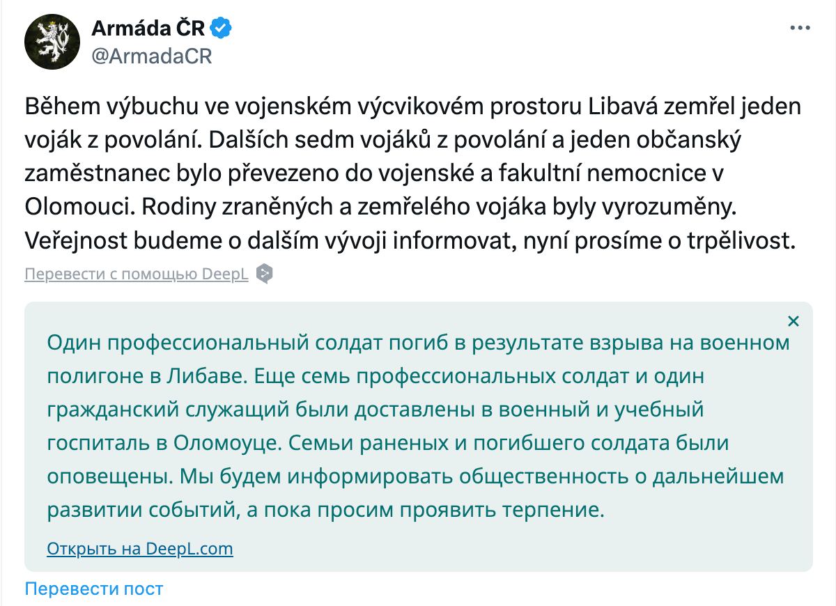 О происшествии сообщают соцсети вооруженных сил Чехии и сайт ČTK.