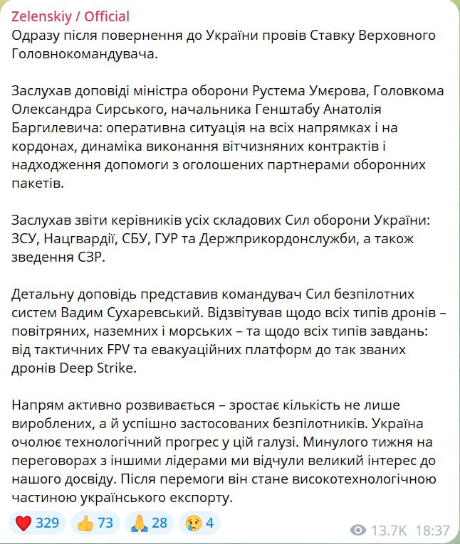 "Подробный доклад представил командующий Силами беспилотных систем Вадим Сухаревский. Отчитался по всем типам дронов – воздушных, наземных и морских – и по всем типам задач: от тактических FPV и эвакуационных платформ до так называемых дронов Deep Strike", – добавил президент.