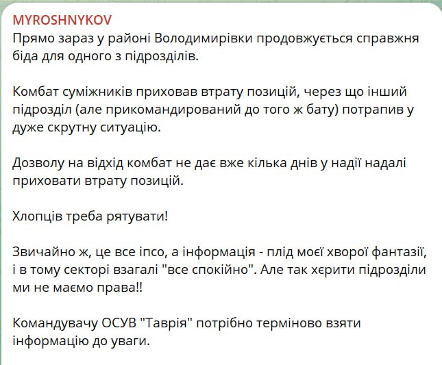 "Прямо сейчас в районе Владимировки продолжается беда для одного из подразделений. Комбат смежников скрыл потерю позиций, из-за чего другое подразделение (но прикомандированное к тому же бату) попало в очень затруднительную ситуацию. Разрешения на уход комбат не дает уже несколько дней в надежде в дальнейшем скрыть потерю позиций. Ребят надо спасать", – написал он.