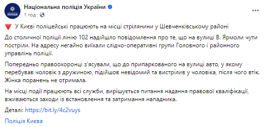 "В столичную полицию линию 102 поступило сообщение о том, что на улице В. Ярмолы слышны выстрелы. По адресу немедленно выехали следственно-оперативные группы главного и районного управлений полиции. Предварительно правоохранители выяснили, что к припаркованному на улице авто, в котором находились муж с женой, подошел неизвестный и выстрелил в мужчину, после чего скрылся. Женщина ранений не получила", - говорится в сообщении полиции.