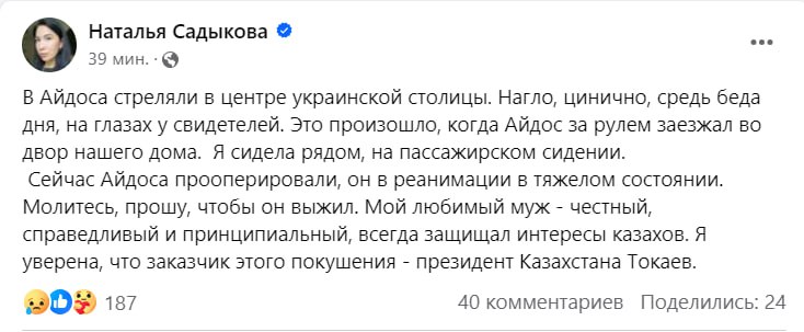 "В Айдоса стреляли в центре украинской столицы. Нагло, цинично, средь бела дня, на глазах у свидетелей. Это произошло, когда Айдос за рулем заезжал во двор нашего дома. Я сидела рядом, на пассажирском сидении", – написала Наталья Садыкова.
