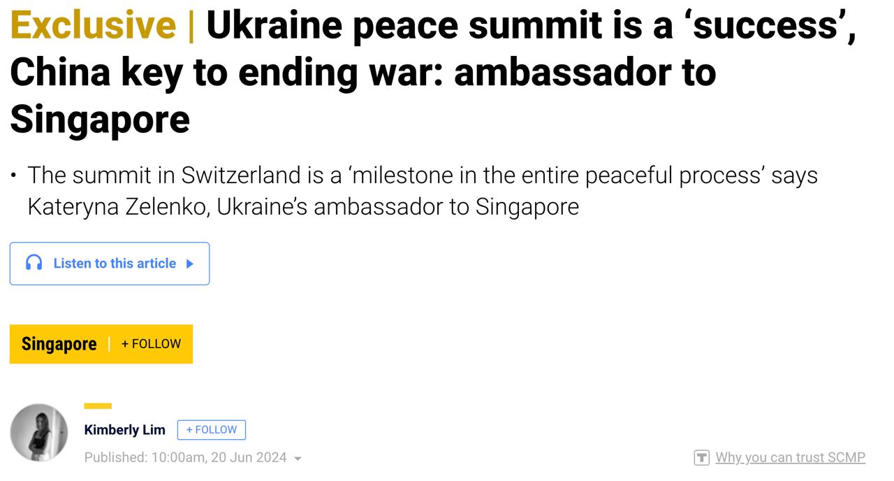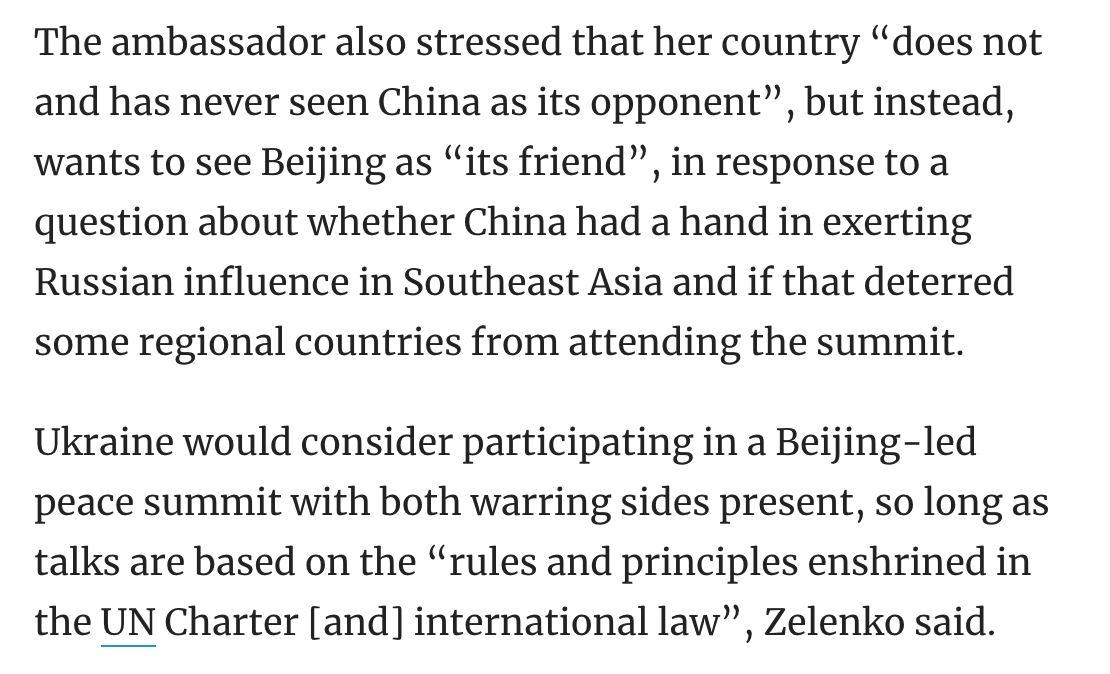 12:05 Украина допускает свое участие в китайском мирном саммите с участием РФ, заявила посол Украины в Сингапуре Екатерина Зеленко в комментарии South China Morning Post.