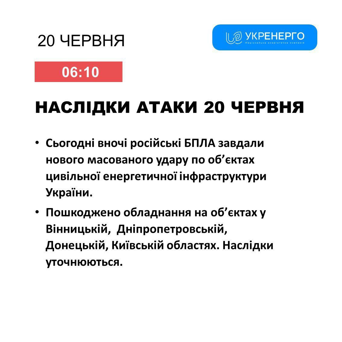 07:00 Сегодня ночью российские дроны атаковали объекты энергетики в Киевской, Винницкой, Днепропетровской и Донецкой областях.