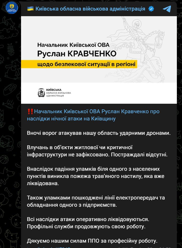 07:59 В Киевской области обломки дронов повредили оборудование одного из предприятий, заявляет ОВА. Также повреждены линии электропередач.
