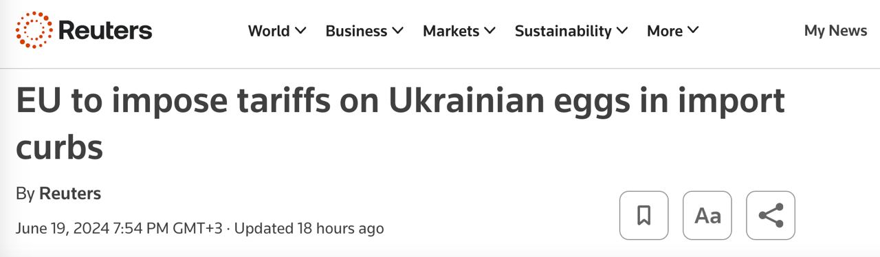 Также Еврокомиссия объявила о введении импортных пошлин на украинские яйца и овес. Об этом сообщает Reuters.