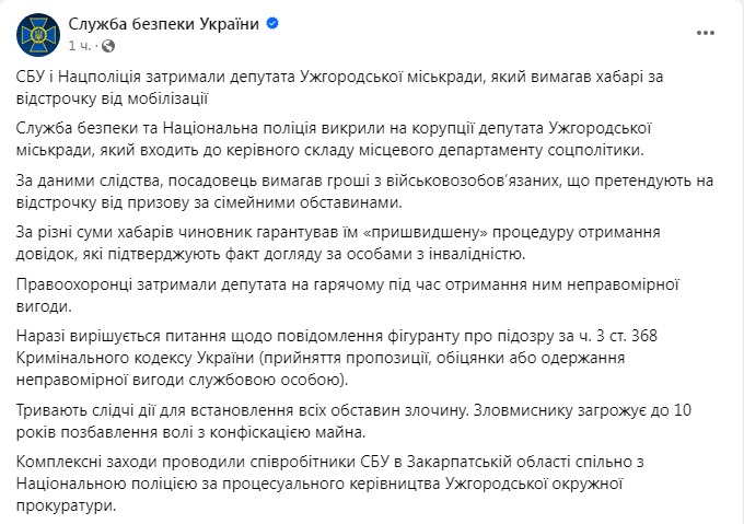 СБУ и Нацполиция задержали депутата Ужгородского горсовета, требовавшего взятки за отсрочку от мобилизации.