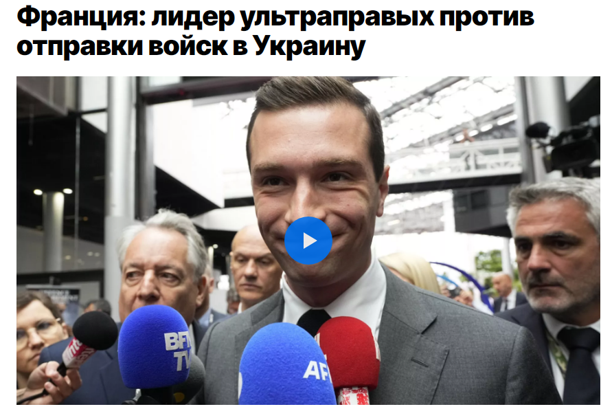 Лидер французских ультраправых из "Национального объединения" Жордан Барделла заявил, что выступает против отправки войск в Украину, хотя и поддерживает право Украины защищаться от России.