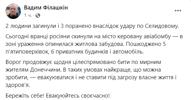 В пятницу, 21 июня, российские войска ударили авиабомбой по городу Селидово Донецкой области. Два человека погибли и трое ранены.