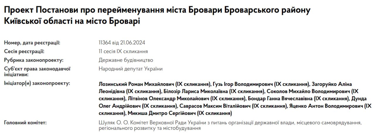 Группа народных депутатов во главе с Романом Лозинским из фракции "Голоса" зарегистрировали в Верховной Раде проект постановления о переименовании города Бровары в Киевской области в Бровари.