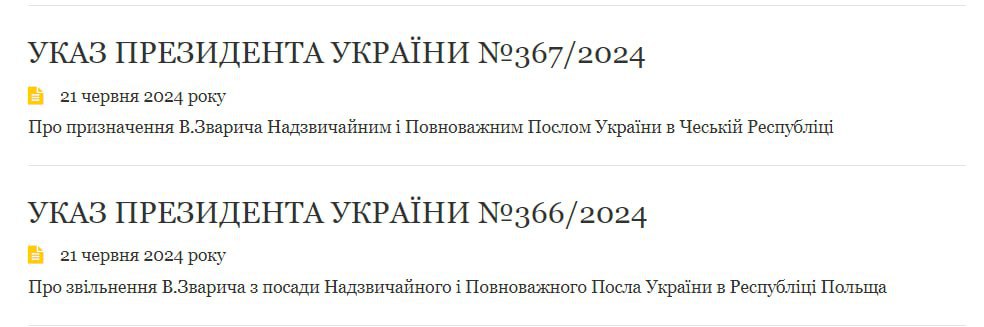 Владимир Зеленский уволил Василия Зварича с должности посла в Польше и назначил его послом в Чехию.