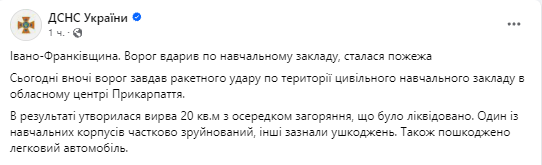 В ГСЧС сообщают, что в Ивано-Франковске ракетный удар был по учебному заведению, там начался пожар.