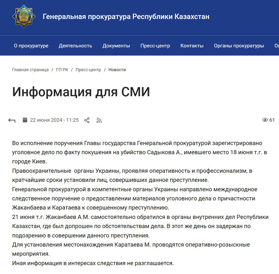 "21 июня т.г. Жаканбаев А.М. самостоятельно обратился в органы внутренних дел Республики Казахстан, где был допрошен по обстоятельствам дела. В этот же день он задержан по подозрению в совершении данного преступления.
