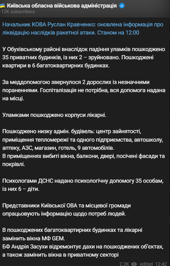 В Киевской ОВА сообщили, что в Обуховском районе в результате падения обломков повреждены 35 частных домов, из них 2 – разрушены. Повреждены квартиры в 6 многоквартирных домах.