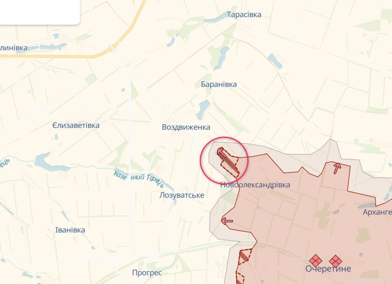 По данным паблика, армия РФ прошла к северо-западу от Новоалександровки к селу Воздвиженка, после которого дорога к трассе становится открытой.