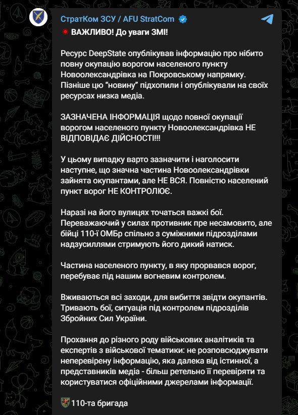 При этом в 110-й бригаде ВСУ сегодня опровергли информацию Deep State о потере Новоалександровки.