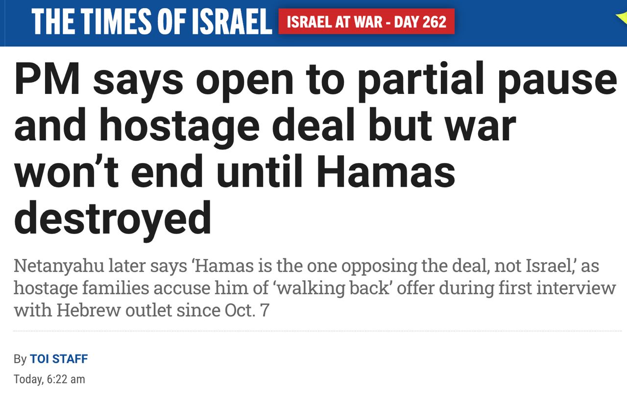 По словам Нетаньяху, "фаза интенсивных боев в секторе Газа подходит к концу", Израиль открыт для "частичной паузы" и сделки по освобождению заложников, но в целом война не закончится, пока ХАМАС "не будет уничтожен".