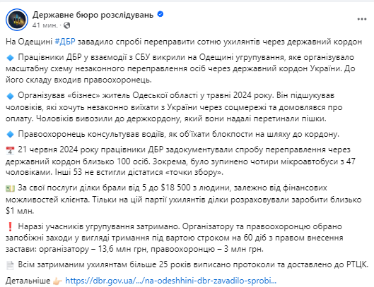 Организовал бизнес житель Одесской области в мае 2024 года. Он подыскивал мужчин, желающих незаконно выехать из Украины через соцсети и договаривался об оплате. Мужчин вывозили до госграницы, которую они в дальнейшем пересекали пешком.