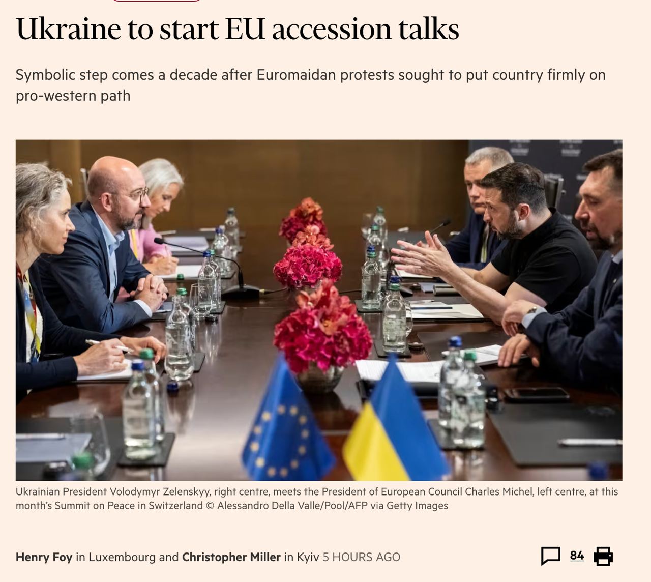 Между тем европейские чиновники заявили газете Financial Times, что предметные переговоры о вступлении Украины в ЕС скорее всего начнутся уже с 2025 года.