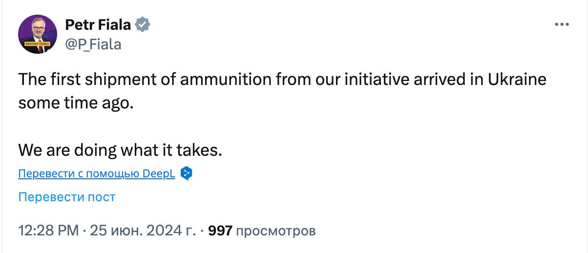 Первая партия боеприпасов, закупленных в рамках чешской инициативы, уже прибыла в Украину "некоторое время назад".