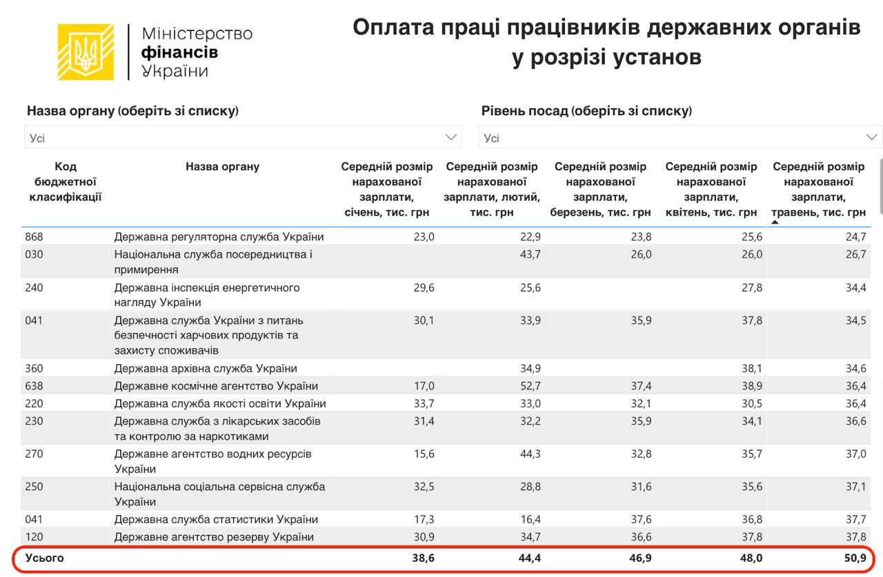 Средняя начисленная зарплата в мае достигла 50,9 тысяч гривен, тогда как в январе было 38,6 тысяч гривен.