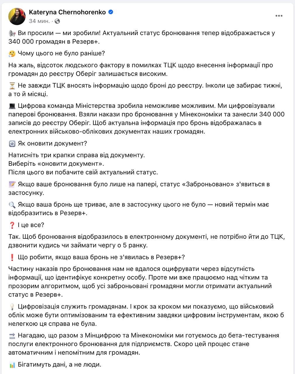 Пока эти 340 тысяч людей не все забронированные. Часть приказов о бронировании все же не удалось оцифровать из-за отсутствия информации, идентифицирующей конкретное лицо. Тем не менее, ведомство работает над четким и прозрачным алгоритмом, чтобы все забронированные граждане могли получить актуальный статус в "Резерв+".