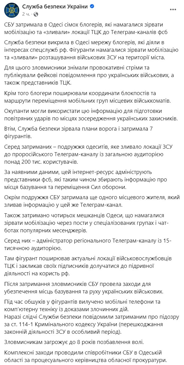 Распространяли данные о ТЦК. СБУ сообщает о задержании в Одессе семерых блогеров