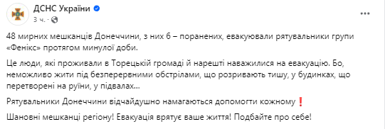 "48 мирных жителей Донбасса, из них 6 – раненых, эвакуировали спасатели группы «Феникс» за прошедшие сутки. Это люди, которые проживали в Торецкой громаде наконец решились на эвакуацию. Ибо невозможно жить под непрерывными обстрелами, разрывающими тишину, в домах, превращенных в руины, в подвалах…" - говорится в сообщении.