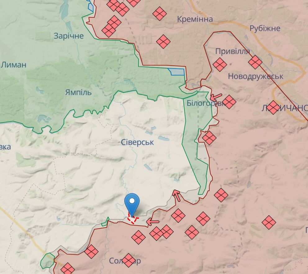 Украинский военный телеграм-канал Deep State сообщал о продвижении РФ в направлении этого села еще 13-14 июня. Карта показывает, что село практически полностью находится в серой зоне.