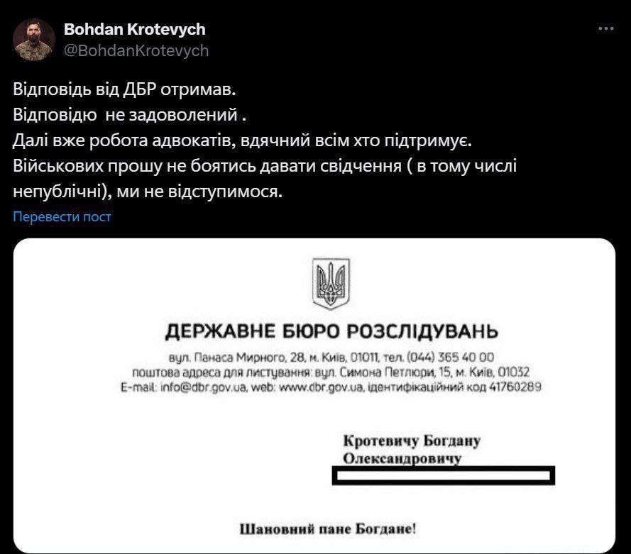 "Ответ от ГБР получил. Ответом не доволен. Дальше уже работа адвокатов, благодарен всем, кто поддерживает. Военных прошу не бояться давать показания (в том числе непубличные), мы не отступимся", - сказано в публикации Кротевича.