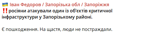 16:39 Россияне ударили по объекту критической инфраструктуры в Запорожском районе, сообщил глава Запорожской ОВА Иван Федоров.