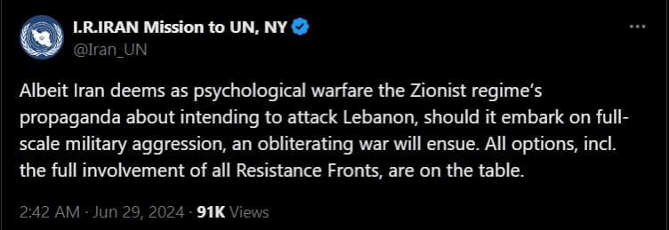 "Несмотря на то, что Иран считает психологической войной пропаганду сионистского режима о намерении напасть на Ливан, если он начнет полномасштабную военную агрессию, начнется война на уничтожение. Все варианты, в том числе полное привлечение всех фронтов Сопротивления, на столе", - говорится в сообщении.