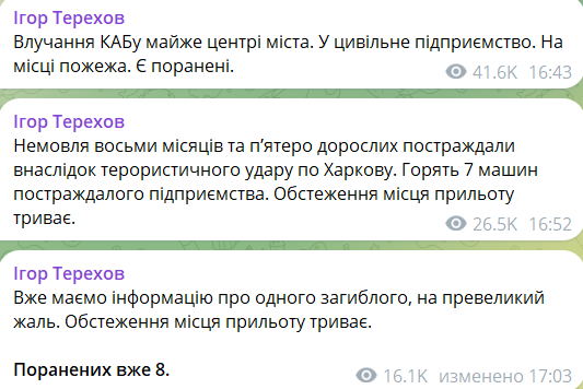 Сначала Терехов заявил, что под удар попало предприятие в центре города. На месте возник пожар. По словам мэра, есть погибший, ранены восемь человек, среди них 8-месячный младенец.