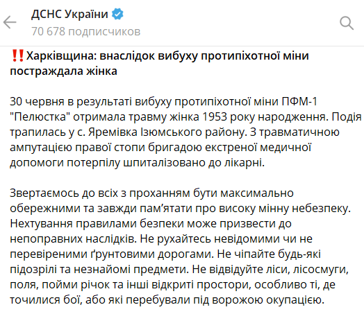 "30 июня в результате взрыва противопехотной мины ПФМ-1 "Лепесток" получила травму женщина 1953 года рождения. Событие произошло в с. Яремовка Изюмского района. С травматической ампутацией правой стопы бригадой экстренной медицинской помощи пострадавшая госпитализирована", - говорится в сообщении.