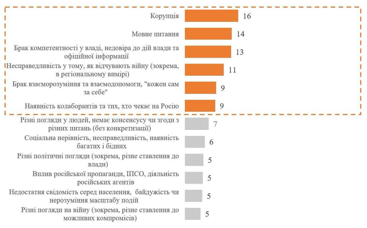 - разное ощущение войны - 11% ("не все регионы ощущают угрозу войны", "нет взаимопонимания между теми, кто на фронте и кто в тылу").
