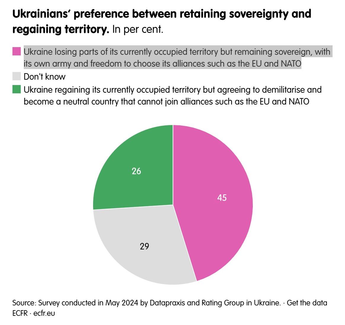 45% украинцев согласны на потерю захваченных Россией территорий в обмен на "свободу выбора" вступления в НАТО и ЕС, сохранение армии и независимости.